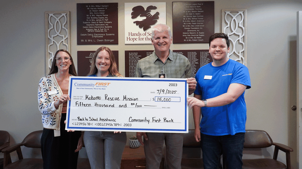 Community First Bank of Indiana, Kokomo, donated $15,000 to support the Kokomo Rescue Mission’s annual Back to School Assistance Program.