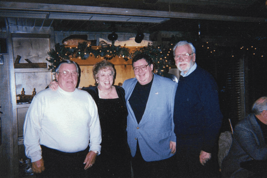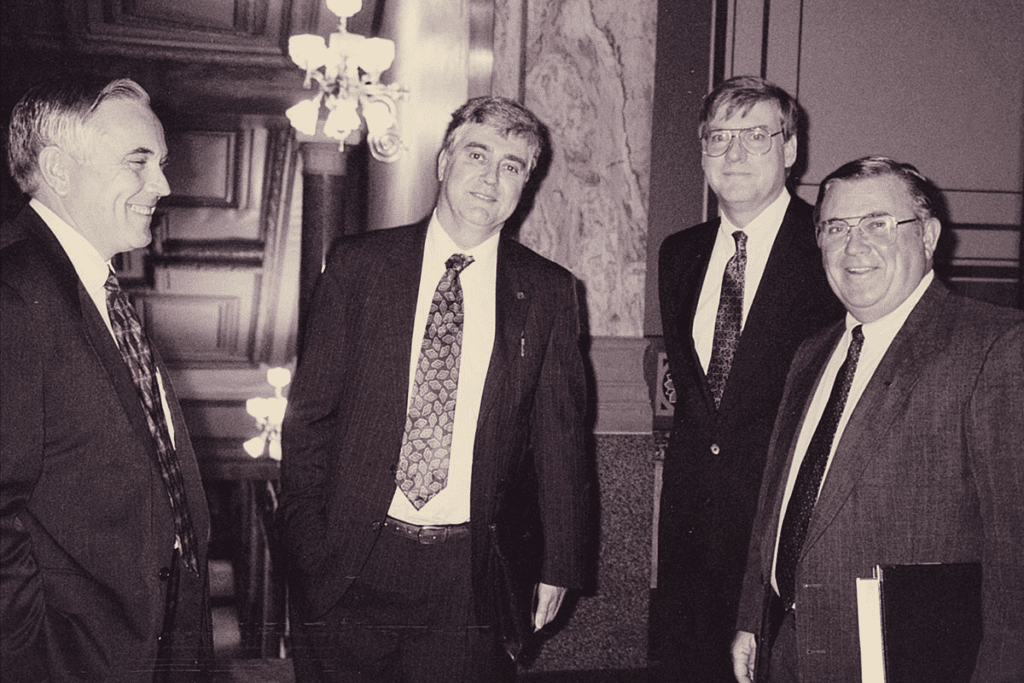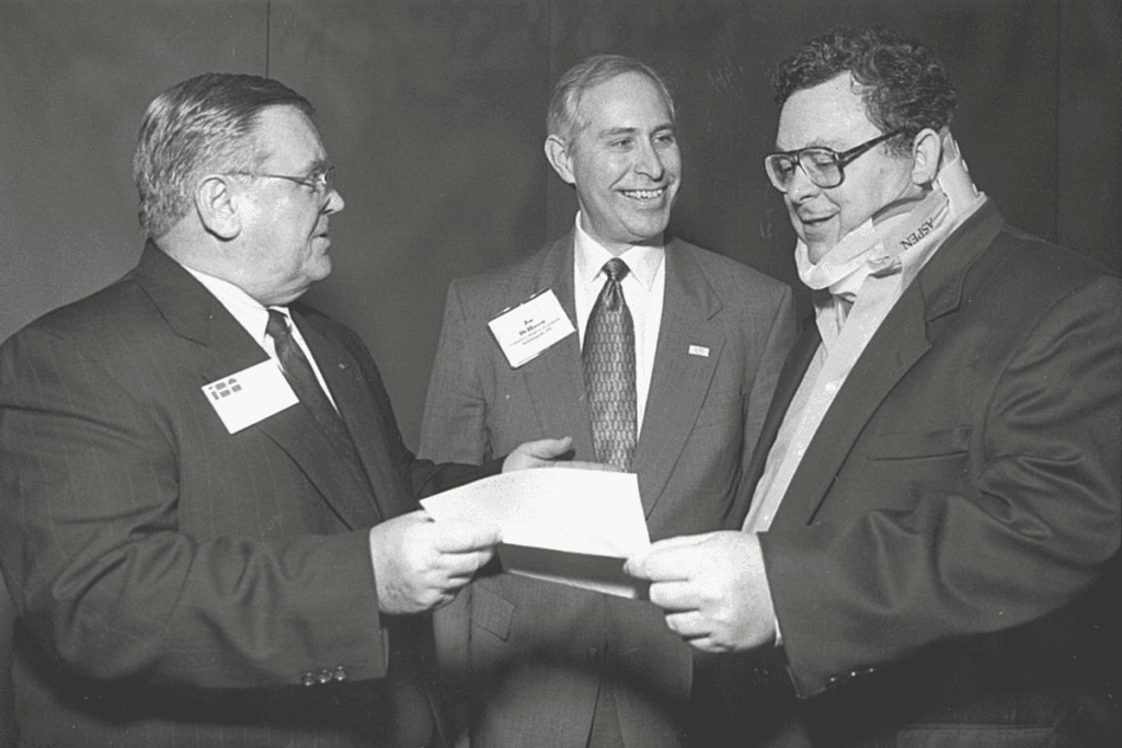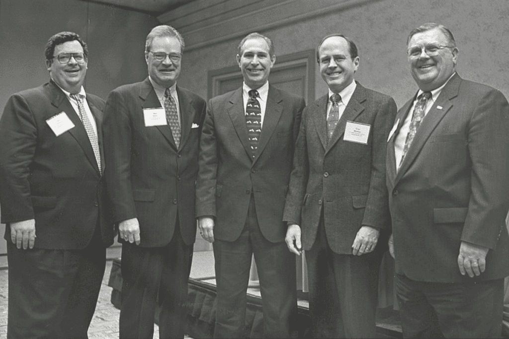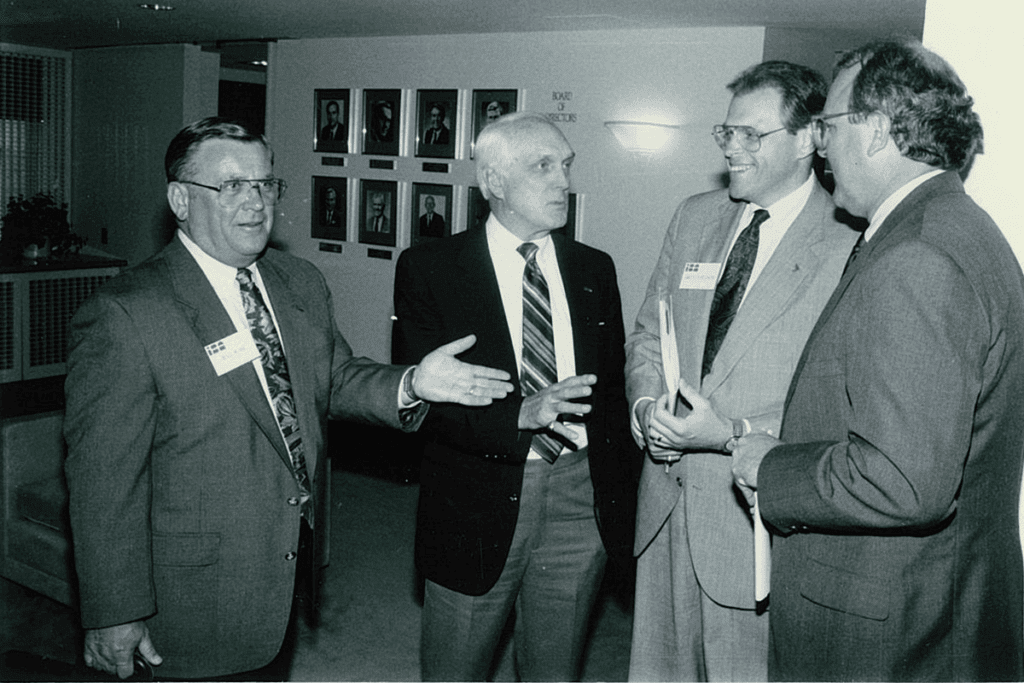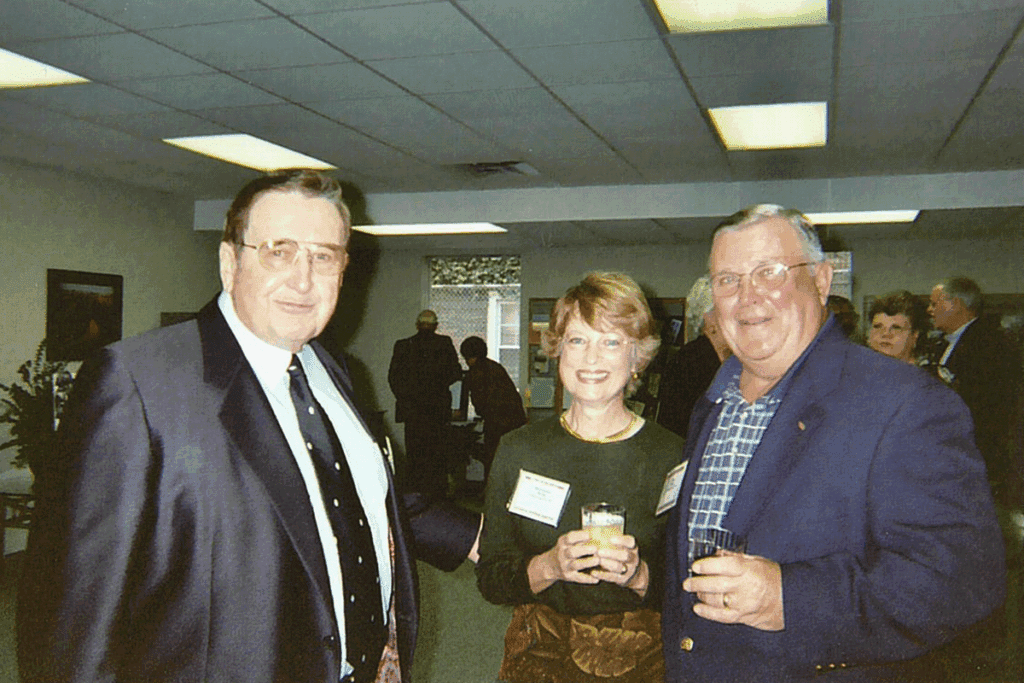 (from left) Bill King, IBA president from 1988-2000; Sandi Crites, IBA staff member; Jim Cousins, IBA president from 2000-06; and Bob Nelson, IBA president from 1967-88; at an Association event in 2001. (IBA photo)