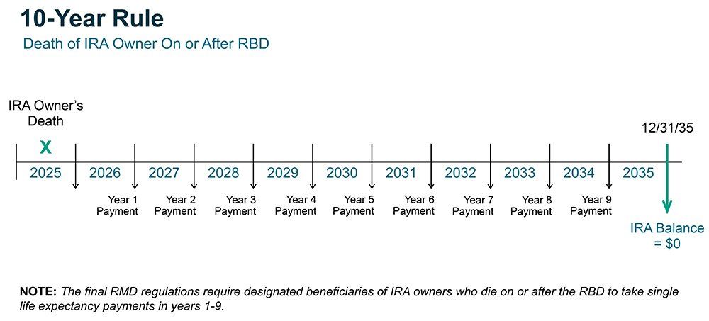 - Designated beneficiaries of account owners who die on or after the required beginning date (RBD)1The Required Begin Date is the latest date at which a retirement plan participant may start taking distributions, according to the statute. Retirement plans may require participants to begin taking distributions at any point between the normal retirement age (as of this writing, typically age 65) and the statutorily required begin date). must take annual life expectancy payments during the first nine years and a total distribution by Dec. 31 of the year containing the 10th anniversary of the account owner’s death.