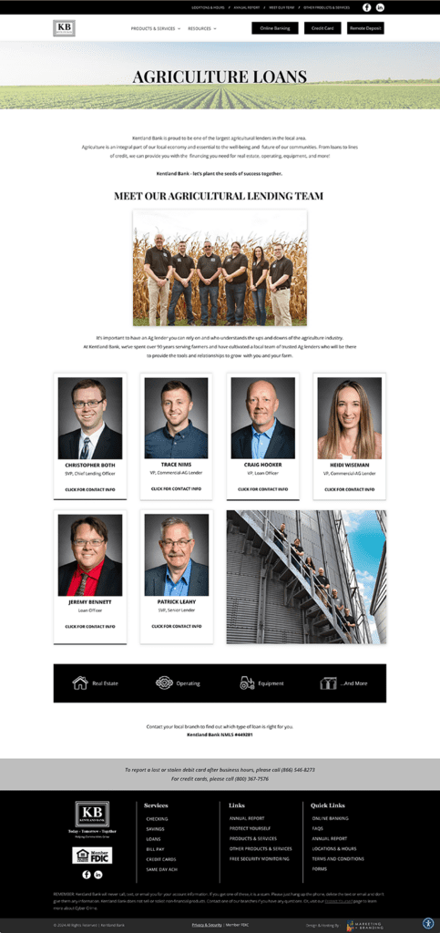 A well-coordinated marketing plan is crucial to maintaining a consistent brand experience across both physical and digital marketing platforms, and instilling trust and credibility with your audience. Kentland Bank exemplified this by integrating a mix of various marketing vehicles to drive traffic and engage farmers and agribusiness owners. This approach amplified their message and increased brand visibility within the local agricultural community. Their campaign included tailored direct mail, thoughtfully timed social media content and an improved website experience. Radio ads featuring their local ag lending team members reinforced the bank’s community roots, airing during prime and agriculture programming times to increase campaign reach and exposure.